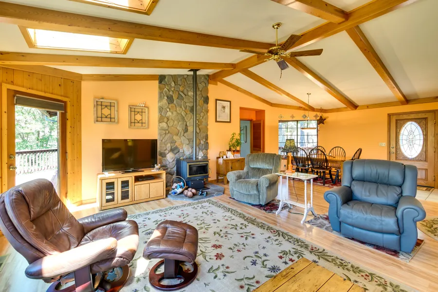 Impressive setting for this 5 acre Mountain style home. Wrap around decking to enjoy the beautifully treed usable acreage. Open floor plan and spacious Great Room with vaulted pine beamed ceilings. Views of the foothills from the wood framed picture windows. Below completely finished 12x52 bonus/recreation room with heat, air and separate entry. Detached 42x31 3-car garage /shop offers additional 15x23 upstairs, storage as well. Lovely fenced garden area for your enjoyment. So much to offer! Come take a look.