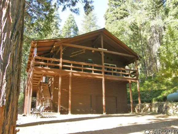 Great cabin in the woods! Wide cedar planking for wall/ceiling paneling, birch cabinets, pine floors, laminate floors in kitchen and baths. Large covered deck off of the living room and master bedroom. Master has a slider to access the deck. Hot tub off of the covered deck with outdoor shower. Sauna in half bath. Newer vinyl clad double pane windows throughout. Gas wall heater and wood stove to keep you warm and cozy. New roof in 2012. You can sit anywhere on your wrap around decking and enjoy the great outdoors and nature. Extra sleeping/storage downstairs. Close to the Stanislaus River for fishing.