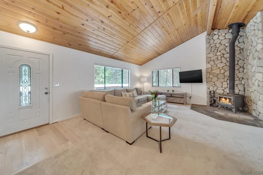 Come see this immaculate family cabin which features an open and bright great room with vaulted pine ceilings and an adjoining dining and kitchen area. The kitchen cabinets have been updated and new carpet and flooring has been installed in the entry, kitchen and bathrooms. New paint throughout plus new interior and closet doors. Check out the new lights and ceiling fans too! This single level beauty would make a great full time or vacation home with its central heat and Smart Thermostat technology is a must in the mountains! The cozy wood stove gives you that warmth and a rustic feel. High speed internet available too! Enjoy time on the front or on the spacious back decks. You also can swim in the pool at the Sequoia Woods Country Club with their social membership. Storage area underneath for your bikes, kayaks and more. Located in a quiet area of Arnold.