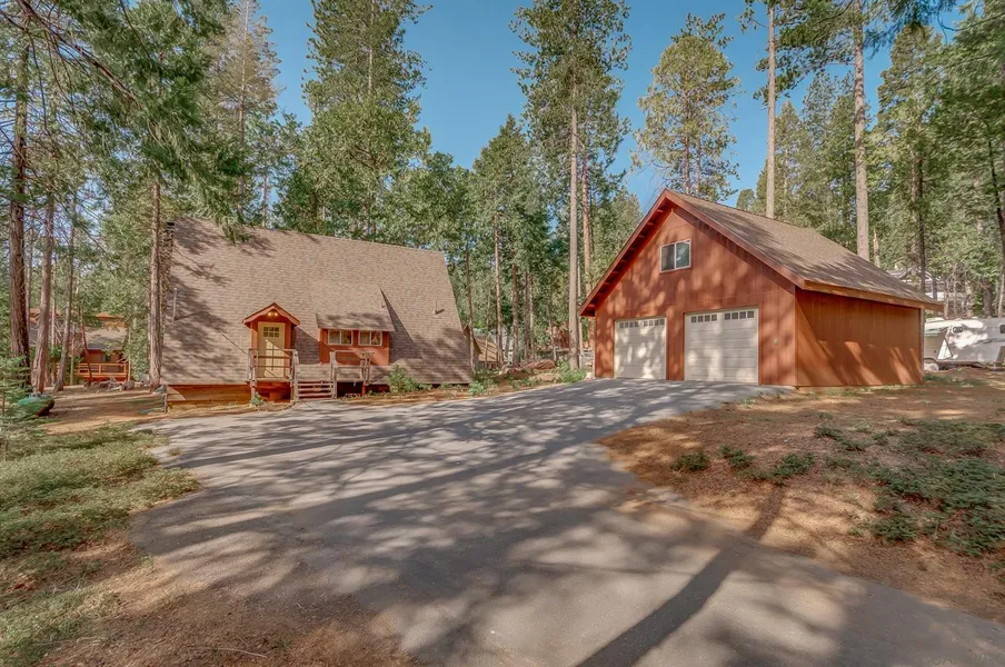 Blue Lake Springs A Frame with 3 Bedrooms, One Bath AND with Detached Two Car Garage with Potential Bonusroom/Familyroom/Masterbedroom and Bath on a NICE LEVEL LOT! This Older Cabin and Detached Garage have Newer Composition Roofs and Exterior Paint, Newer Pergo Bamboo Flooring, Newer Garage Door & Front Door & Side Door on Garage(that goes to upstairs to potential extra living space with bath).