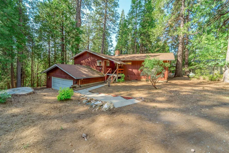 Arnold Mountain Cabin with Open Kitchen/Dining Area/Livingroom plus a Familyroom(with it's own sliding door out to the backyard), 3 Nice Sized Bedrooms, 3 Baths, and Attached Two Car Garage. The Wall of Windows in the Livingroom brings in the Beautiful View of Pines and Cedars and Nice Feeling of Privacy. The vaulted ceiling and fireplace, plus walking out onto deck from Livingroom are other great features of the Livingroom and the mountainy feeling. The backyard is a great area for kids to play(and adults).
