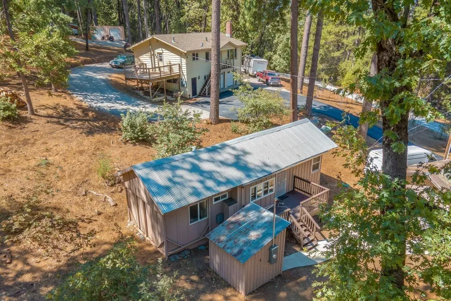 Rare opportunity to own two houses located in a park like setting on almost 5 acres in Murphys for only $450,000. Main house has two bedrooms, one bath, spacious kitchen, living room, and deck access on one level, downstairs is a basement area with full bath and studio setup, plus supersized two car plus garage. Separate cabin has one bedroom, one bath, living room, spacious kitchen, carport. Main house currently rents for $1300 and cabin rents for $800. Three separate sheds on property, one which is newer. Fruit tree orchard boasts apples, peaches, cherries, pears, figs, pomegranate, and more. RV drive thru pad with 30 amp and cleanout. Improvements include some new flooring, electrical 200 amp panel, stainless steel range, several dual pane windows, insulated garage doors, metal roof replaced on cabin, four mini splits in main house and three in cabin. Fresh compaction process for the gravel driveway and fresh reseal for the blacktop paved driveway. Spread out on usable acreage. Rural residential zoning permits horses and poultry. Bring your toys! Well cared for property - seller has been living onsite. Several pieces of yard equipment may be negotiable. Tenants are on month to month tenancy. Beautiful grounds, easy access to downtown Murphys. Property is located on Highway 4. Being sold as is.