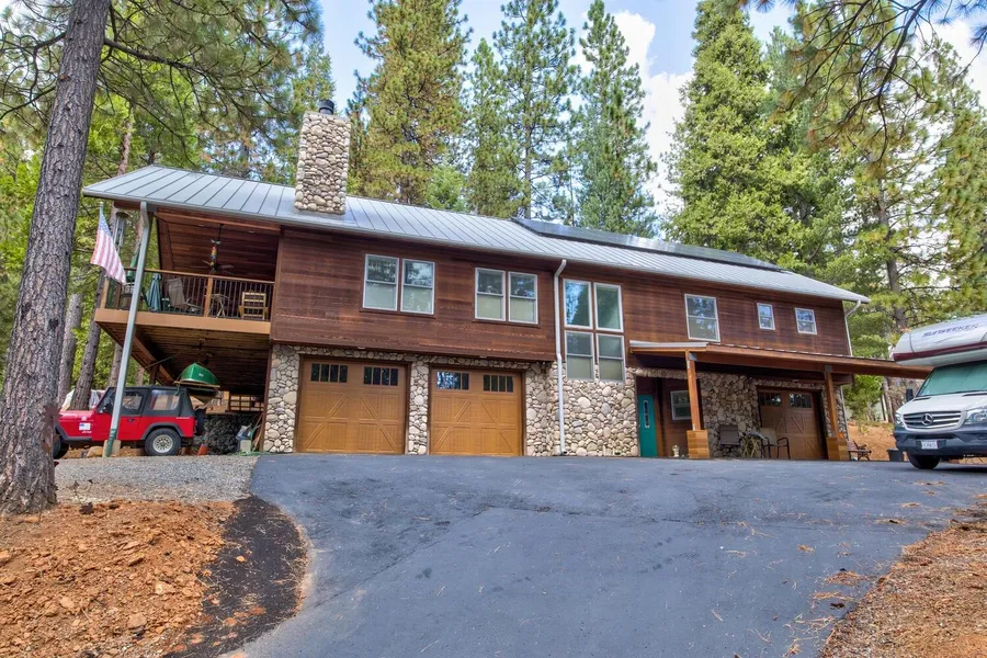 2385 square foot high quality home plus 1530 square feet of garages for 3 cars and an adjacent workshop, all on 1.13 acres. Spacious living room has vaulted ceiling and wood accents. Propane radiant flooring heating. Gourmet kitchen has granite slab counters and hickory cabinets. No knot hole cedar exterior siding. Up grades include: Owned large solar electric system, whole house generator, 50 year rated metal roof is 9 years old. Covered deck. Fireplace mantel from a 125 year old building. Includes the right to use Fly In Acres lake and beach.