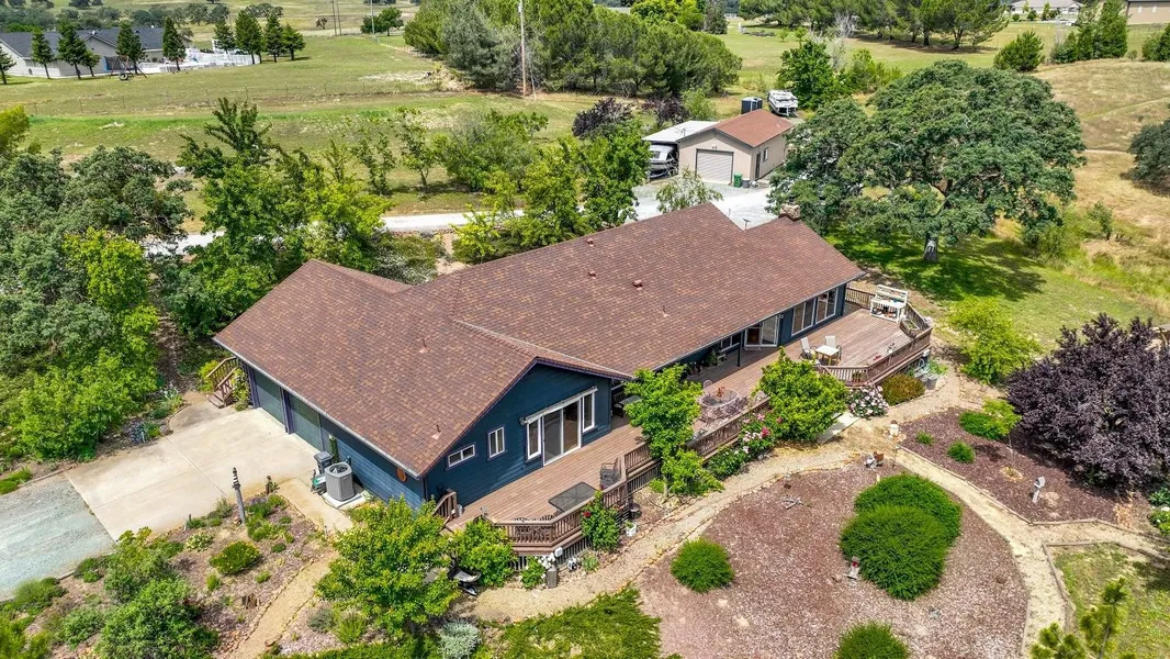 10 Usable Acres with a New attractive Price! This Custom built home has it All, PRIVACY, several trees, large deck to relax and enjoy your property. The 20 x 40 Detached shop with full bath is just perfect for your hobbies with the 220v electricity. BUT that's not all, inside you will find a warm and well appointed home. Custom oak cabinets, kitchen island has an additional sink. plenty of storage and counter space for all the cooks. Under cabinet lighting is a plus. Great room has stone hearth and gas fireplace. Plenty of light and large slider leads to the oversized deck that takes in the views of the Sierra's and the oak studded property. Oak hardwood floors throughout home. 3 bedrooms PLUS an office . Inside laundry with cabinets. Fruit trees and garden beds for the Gardner. Even has a detached Play structure or a reading retreat . Enjoy the quiet country evening around you stone fire pit , or maybe sit by your private pond. So much to see with this 10 acre ranchette