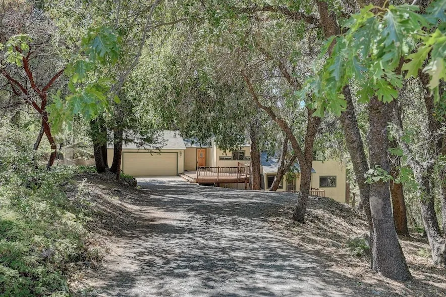 Enchanting 2.84-Acre Retreat with Custom Split-Level Home. Nestled amidst towering pines and majestic oak trees, this 2.84-acre property offers a serene escape with a beautifully designed split-level home that showcases both artistic craftsmanship and energy efficiency. The home features heart redwood ceilings and trim, hand-textured drywall, custom doors, and strategically placed skylights, all demonstrating exceptional attention to detail. With 3 spacious bedrooms, a den, and 2 well-appointed bathrooms, there's ample room for everyone to enjoy. Multiple decks provide the perfect vantage points to soak in the privacy and breathtaking views of the surrounding natural beauty. The expansive, usable acreage offers endless possibilitieswhether for adding additional structures, keeping animals, or simply enjoying the tranquility of your own private sanctuary. Conveniently located on a paved c...