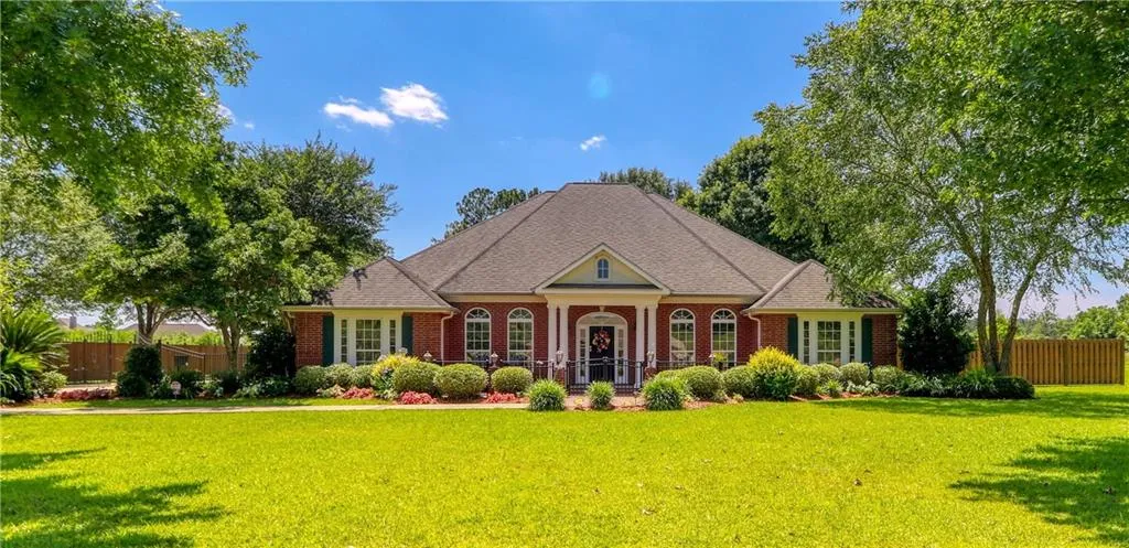 Stunning, custom 4/3.5 home in Moss Bluff w. open split floor plan on 3.44 custom fenced acres. This mint condition 3275 sq ft. home offers large rooms, 11' ceilings, 2 fireplaces, archways, porcelain and hardwood flooring, large kitchen with custom cabinets, granite counter tops and island, over-sized utility room with cabinets and folding table, walk-in pantry, 5 walk in closets, new AC units, spacious master bedroom & bath with jetted tub. Outside offers in- ground saltwater pool, multiple patio areas with professional landscaping & zoned sprinkler system. With beautiful grounds and mature oak trees, there is the feeling of country living but close to town and schools. 60 X 36 barn welcomes horses. 2 car garage with attached brick carport/breezeway. Flood zone X where flood insurance is typically not required. Some interior colors did not photograph accurately.