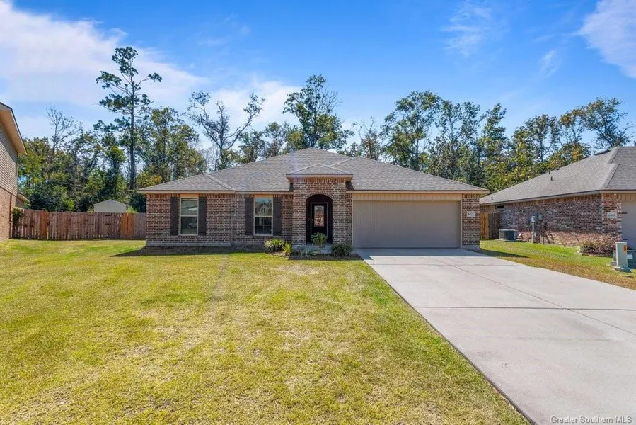 Moss Bluff, Like new 3 bedroom 2 bath Berryvine brick home on slab, open floorplan, large livingroom and diningroom area both with multi-window backyard views, en suite master with large walk-in closet, expanded fenced rear yard, with patio cover, 2 car garage and off street parking. Lawn is turfed-in with landscaping. Underground utilities, concrete streets, subsurface drainage, Home Owner Association. Flood Zone X and Taxes $1403.