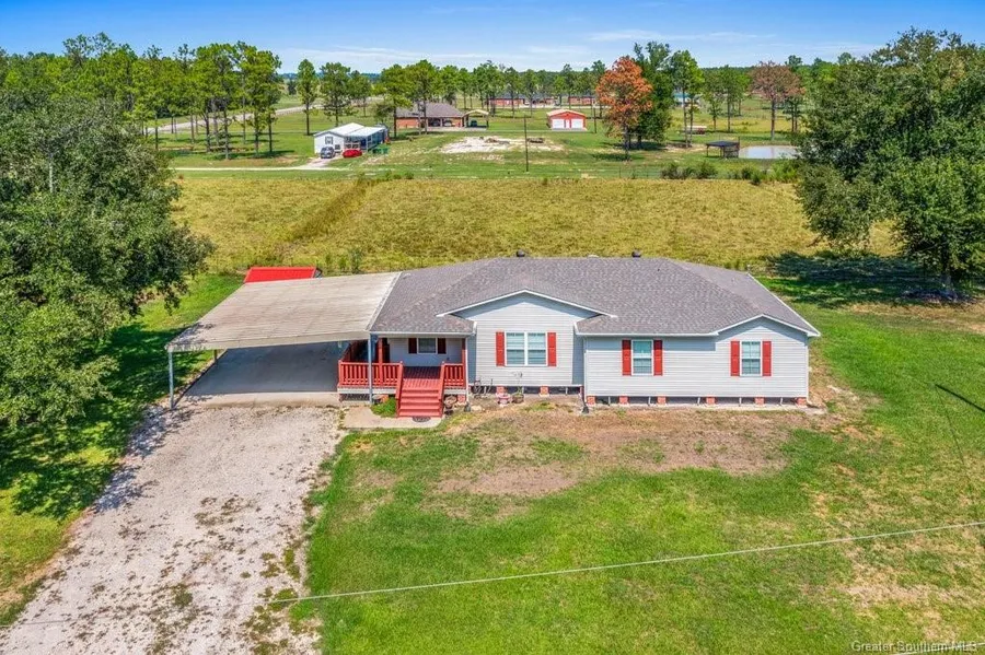 Discover the charm of this well-maintained country home nestled on 9.1 acres within the Gillis Elementary school district. Built in 2012 with a new roof installed in 2021, this 3-bedroom, 2-bathroom home offers a warm and inviting ambiance. Step onto the cozy front and back porches, or park under the 2-car carport with a convenient handicap ramp. Inside, the home boasts a spacious living room with ample natural light and French doors leading to the back porch. The kitchen features an attached dining space, abundant cabinetry, a built-in desk, a gas stove, a fridge, and a dishwasher. The master suite is a retreat in itself, complete with an attached bathroom featuring two sinks, a soaking tub, a shower, and dual closets. A central laundry room adds practical convenience, while the spare bedrooms offer comfort with carpeting and generous closet space. The 9.1 acres was recently surveyed and is cross fenced with 2 front pastures. An additional pasture graced with a pond on the back 4 acres is accessible via a shared driveway. Don't miss the opportunity to own this tranquil slice of countryside living.