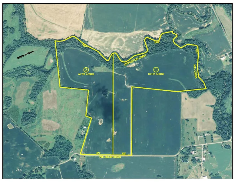 FARMLAND AUCTION: 146.87 acres offered in 2 tracts & combination. 119.76 FSA Crop Acres * 1,371' Road Frontage * New Survey * Productive Crider & Haymond Silt Loam soils * 6,410' creek frontage on Livingston & Mill Creeks * County Water * woodlands w/Hunting & Recreational Potential. Tract #1 - 80.175 acres with 500' road frontage and 2,358' of creek frontage on Livingston Creek and 2,151' creek frontage on Mill Creek. This tract consists of open tillable land with woodlands along the creek. Tract #2 - 66.701 acres with 871' road frontage and 1,901' creek fontage on Livingston Creek. This tract consists of tillable land and some woods along the creek.