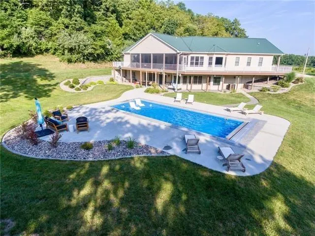 Captivating Ranch Home on 20 Acres! Spacious 4 bedroom home features tall ceilings and not 1 but 2 kitchens! Main floor kitchen with stunning views of the property offers plenty of cabinetry and opens up to a new composite deck overlooking the saltwater inground pool. The oversized master suite has a vaulted ceiling, huge walk-in closet and large master bathroom w/double vanity, jetted tub and separate shower. Convenient main floor laundry. The finished walk-out basement has a 4th bedroom, storm shelter, multiple storage areas, large bathroom, kitchen and recreational room. This acreage is made up of grass/pasture, some timber with plenty of turkey, deer, a variety of birds, and wildlife. The amenities of this home are amazing and include the following: main level deck with brand new composite material, lower patio with Bose speaker system, newer landscaping. If you are looking for a taste of the country, privacy and scenic views it is a must see! Plenty of storage and an unfinished room to make into your own desire. Awesome location near 36 Hwy.