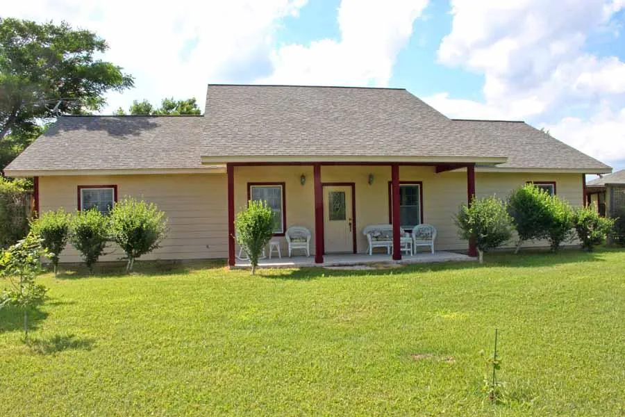 Great opportunity to own a mini ranch and home this close to town. Home offers spacious rooms, High ceilings in Living area, rock fireplace, kitchen with built-ins, covered porches, nice master suite. The property offers 30 plus beautiful acres with scattered oak trees, some coastal grasses, large pole barn, detached garage with 1/1 apartment, nice pond with windmill, water wells, great yard, great location on paved road. Only minutes from town .Must see!