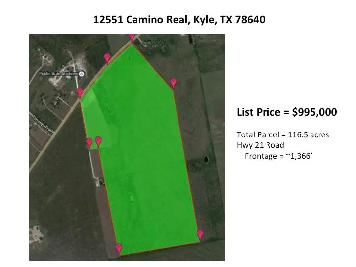 Perfect Property for Development! Subdivision planned for directly across street with MUD (Municipal Utility District) being installed for sewer system. Direct path of Buda/Kyle growth. RV park being build just down the road. Short six minute drive to IH35 using FM 2001. Short Drive south to San Marcos via Hwy 80. Water Lines on Hwy 21, Natural Gas Lines on Hwy 21 on other side of road. Great place to park 1031 Exchange Funds. Perfect future subdivision or Mobile Home Park. Great Opportunity.