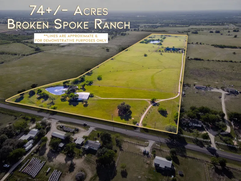 Come check out the Broken Spoke Ranch, this beautiful homestead that's been in the family for over 7 decades. As you drive into the automatic gated entrance you will be welcomed by the 100 year old oak tree and the old wagon sitting under it. The property has perimeter fencing with game fencing on two sides, goat/sheep 5 foot wire on one side, pipe fencing in the front, and cross fenced with 3 pastures including a hay pasture with coastal and blue stem grasses. This is a working ranch set up already for cattle with chutes, pen panels and pole barns to help protect livestock during harsh weather. There are three large tanks, a two acre fenced homestead with a 2400 square foot, 4 bed 3 bath authentic log cabin with a wrap around porch, mountain cedar posts, solar window panels and a green metal roof with a separate detached oversized matching garage with attached carport. The home boasts tall ceilings in the living area, wood burning fireplace surrounded by Austin stone. The ensuite is on the main floor and has a garden tub with separate shower and walk in closet. There is another full bath and bedroom split from the ensuite downstairs. Upstairs is a game room, 2 more bedrooms, and a full bath. The home is well cared for and the details of this loved home is shown in every corner including the wood planks on the ceilings. The Ranch has access to community water and a 600 foot deep water well with a 1500 gallon harvesting reservoir well system with pressure pump in case power goes out. There is also a huge 80x90 barn on a 1500 sq foot concrete slab with two over hangs, a roll up door, perfectly set up for a ranch hand with a room and full bathroom and plenty of storage. This is a must see!
