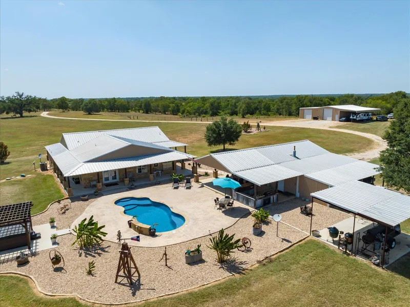 Sprawling horse ranch with custom home, pool, workshop, stables, and lighted arena in Lockhart. Pride of ownership is an understatement--from custom pipe fence w/ automatic entry to clean fence lines--this property is captivating. 1300+/- ft of road frontage w/ 4 parcels make up this 40 acre ranch. Perfectly situated, the 4BD/3BA custom built farmhouse has a wrap around porch overlooking the manicured landscaping. Thoughtfully designed w/ an open floor plan and sought after finishes. An enormous kitchen offers an abundance of white cabinets, a timeless backsplash, and expansive counter space! The walk in pantry, built-ins, and hall tree in the mudroom, secondary sitting area and large dining space have been designed with convenience in mind. Just off the living area with a fireplace and vaulted ceilings is the primary suite with access to the backyard and an impressive en suite bathroom with dual vanities, dedicated shower, and walk-in closet--check out the door straight to the laundry room! There are three secondary bedrooms, two share a jack-n-jill style bathroom, the other has a built in desk and walk in closet. Step into paradise in your private backyard--the detached 2 car garage/party barn has a second kitchen and bathroom. The outdoor kitchen overlooks the in ground swimming pool and above ground hot tub. Covered and uncovered patios around the pool allow for comfortable entertaining. This expansive property offers sought after out buildings including a 50x55' shop w/ 3 roll up doors and 14' walls, w/ 20x50' covered parking w/ water. Just beyond the home are the exceptional 90'x55' horse facilities w/ 5 stalls (4 have turn outs), wash area, and oversized tack room with easy proximity to the lighted arena. This property has been thoughtfully improved with cleared pastures while leaving native trees to allow for wildlife and riding trails. Fenced, cross fenced, ag-exempt, unrestricted is a must see just 1 hour southeast of Austin.