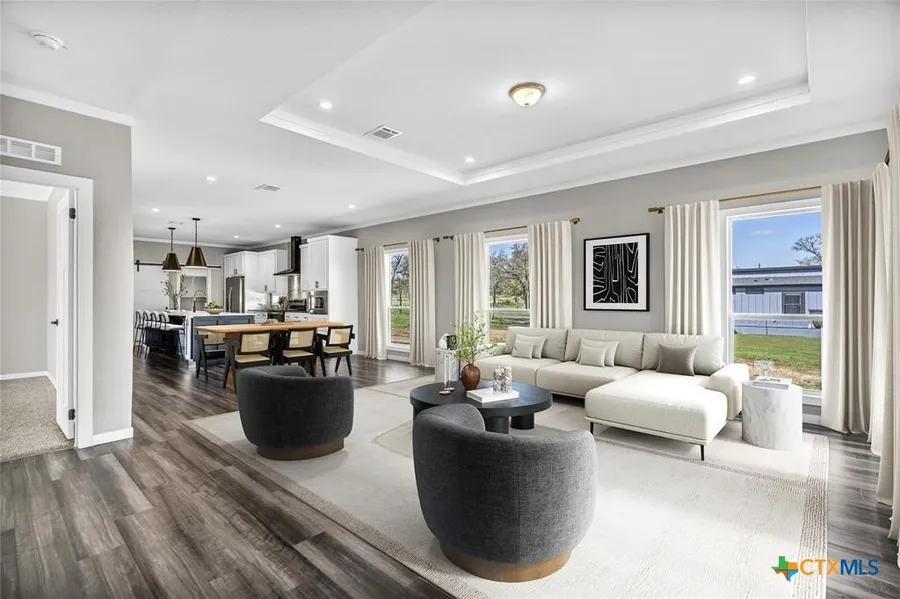 Set on over 2 acres with mature trees and a peaceful creek at the back, this modern masterpiece offers the perfect blend of quiet country living and city convenience, all on a paved road less than 30 minutes from Austin. Unlike anything else on the market, this home stands out with its sleek modern design, clean lines, and thoughtful details throughout. Step inside and be amazed by the spacious open layout filled with natural light, a designer kitchen with a statement island, and living spaces built for both comfort and entertaining. The owner's suite is a private retreat with a spa-style bath, walk-in closet, and views of the serene outdoor setting. Outside, enjoy the expansive yard, room to grow, and the beauty of your own creekside backdrop. This property delivers a rare combination of style, space, and Texas charm.