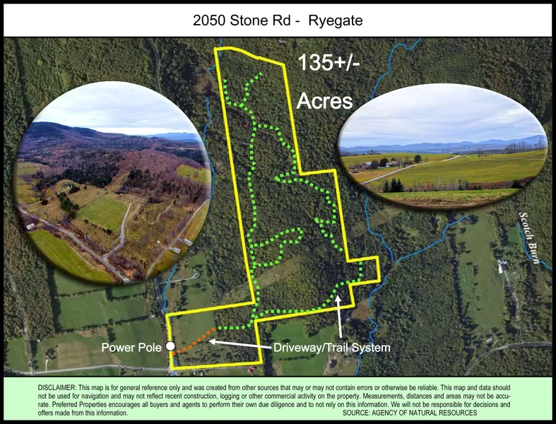An excellent property of 135+/- acres, perfect for the avid outdoorsperson interested in homesteading, hunting, or recreation in Ryegate, VT. The mixture of productive hay fields and wooded pasture land adjacent to the road frontage make for an excellent potential country home site, accented by vintage stonewalls and quaint streams. Owner has installed an excellent driveway complete with culverts. The views from much of the property are simply outstanding. The sprawling eastern side of the property features open and rolling woodlands – predominantly softwoods to the north and a smaller section of hardwoods to the south. These open woodlands and surrounding active agricultural fields make a terrific corridor for deer, moose, and grouse hunting. Looking for a long range shot? Hunt the apple tress under that 150 foot wide industrial power line running the short width of the property. ...