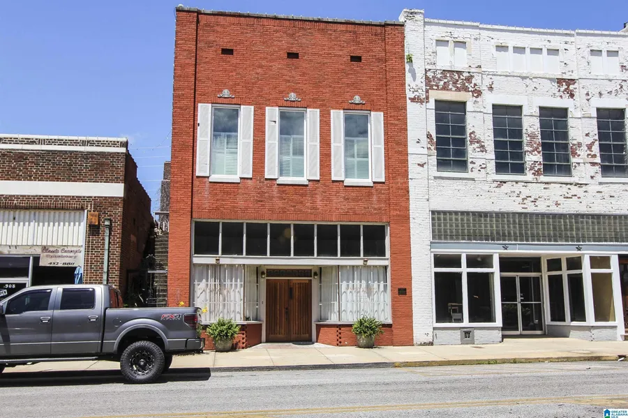What an opportunity in the Historical District of Downtown Anniston! This 2-story brick row building features double solid wood front doors made from Honduran mahogany, with unique glass tiles overhead. This is a prime location for opening your business downtown, and there is a loft apartment upstairs (reminiscent of a Savannah, GA apt) where you can live or host guests as a vacation rental. The apartment is overflowing w/ charm & character w/ two fireplaces, exposed brick walls, high ceilings & huge windows! There is a wrought iron gate & exterior staircase to access the apt from the street without entering the main level store front. Just a few of the stunning features include heart pine floors, stained glass window & a clawfoot tub dated 1935. Windows were updated in 2022, and the metal roof has been coated & waterproofed w/ aqua seal. You will adore the charming courtyard out back w/...