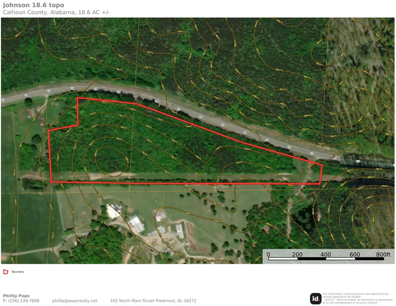 The property is a rolling undeveloped tract with 2,000+ feet of highway frontage. Electricity and water are available. The property is unrestricted and in the Calhoun County School District, however Piedmont City Schools have open enrollment and would be the closest in proximity to the subject. The topography is rolling (see attached topo map).