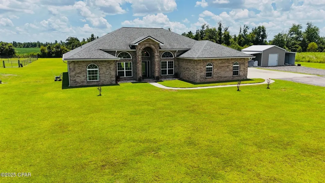 Welcome to this beautifully maintained 3-bedroom, 2.5-bath brick home situated on a serene 9.7-acre property. Inside, you'll find an updated kitchen and spacious living area featuring stunning 14' vaulted ceilings and elegant ceramic tile flooring. The bedrooms offer comfort and style with 9' ceilings, newer carpet and a Jack and Jill bathroom. The master suite is a true retreat, complete with a spacious walk-in closet, luxurious walk-in tile shower and a jacuzzi tub. A versatile bonus room currently serves as an office but can easily be converted into a 4th bedroom or a game room to suit your needs. Enjoy the convenience of a 2-car garage and a fenced area ideal for small dogs. A 20x20 mancave/workshop with dual 10x20 lean-tos provides ample space for hobbies, storage, or projects. The property is finished with crushed asphalt for easy access and low maintenance. Surrounding the home, satsuma trees, crepe myrtles, and a graceful willow tree add natural beauty and a peaceful ambiance. Whether you're looking for space, comfort, or country charm, this property offers it all. Schedule your private showing today!