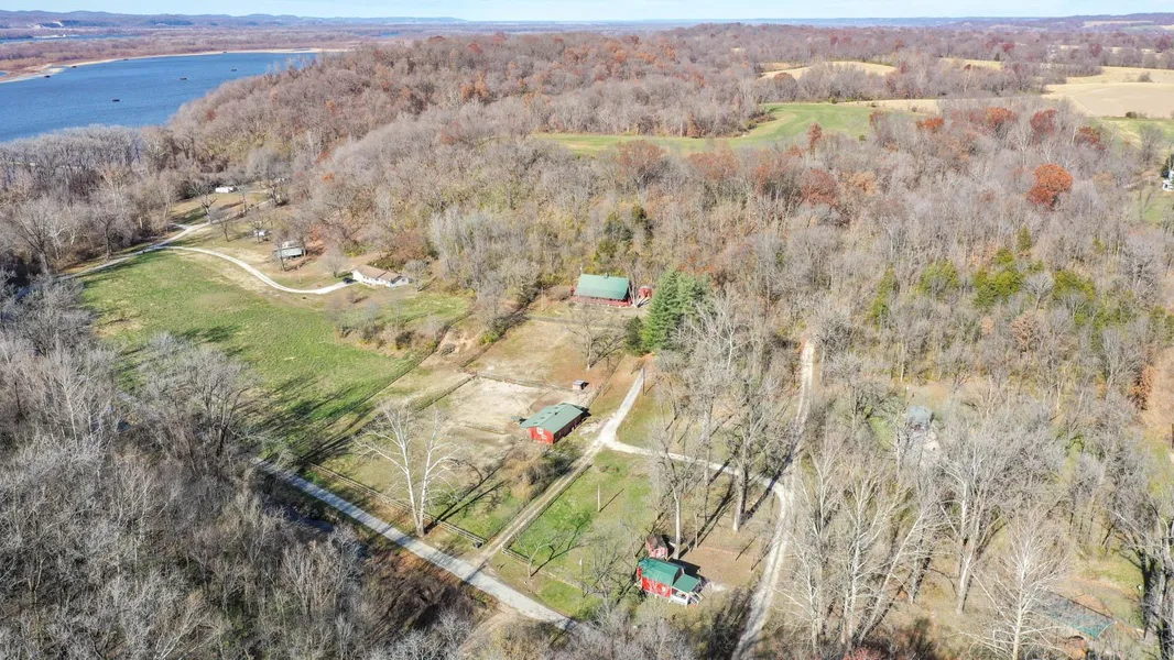 This unique and rustic property is waiting for a new owner! The 2 bedroom, 1 1/2 bath timber, tongue in groove framed home with loft was built in 1994 with covered porches on three sides. The view from the porches is amazing! The home has an open floor plan with 25 ft ceilings in the great room with a propane/real stone fireplace. Floors in the great room, dining room, front entry and kitchen display authentic 125 yr old barnwood. A detached 48' x 21'shed east of the house can be used as a one car garage, with a 12' x 21' carport, and additional storage area or workshop. A metal horse barn with 6 stalls was built in 2005 with 4 exterior Dutch doors and interior sliding stall fronts with feeders in each stall. It's a short horseback ride to the Mississippi River where you can take a beautiful trail ride along river and woods. Check out the red lofted cabin with a kitchen and bathroom! Thi...