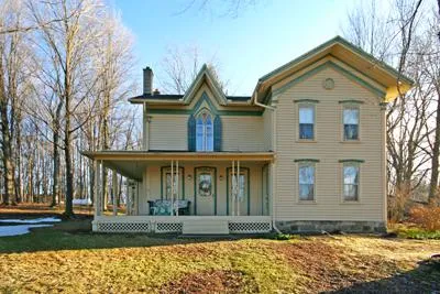This fantastic historic home has been well taken care of through history. The property is half wooded with hardwoods and across the stream is about 10 acres tillable. The cathedral windows in the upper level master bedroom and the wrap around porch along with the lightly wooded setting provide great curb appeal for this country home. The main floor features a bright parlor with fantastic walnut French door entry just off the living room. The living room features French doors all around the room that open to the wrap-around porch. Newly installed wood fireplace takes the chill off the winter nights. The formal dining room is just off the kitchen which also has a dine in eating area. The three seasons room offers space for the hot tub and area before you enter the home. Great character not found in new construction and with a little handy...