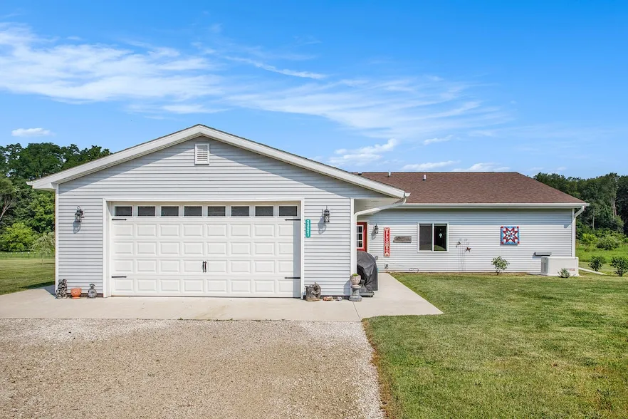 Own your own piece of paradise! This home was finished being built in 2020. The furnace, air conditioner, Refrigerator, oven and two dishwashers were new in 2020. The 8.6-acre property is meticulously groomed. Enjoy berries, fruit trees, a garden, and the potential for hobby farming. The barndominium home is designed for low maintenance and energy efficiency, and boasts over 2,000 sq. ft. of living space with large bedrooms, an open floor plan, and level floors extending to the outside. The incredible views and luxurious master bedroom ensuite add to the charm, while two secondary bedrooms share a Jack and Jill bathroom. This unique, custom home is ready to produce fruit for years to come. Don't miss out schedule your showing today! ENERGY EFFICIENT HOMESTEAD - 4BR, 3BA, 2400 sq ft, attached 2 car (extra 576 sqft) finished garage sitting on just under 9 acres. Huge open floor plan, BEAUTIFUL country views! Master BR & BA is a luxurious suite & feels like vacation - has 2 showers w/benches, separate tub, toilet room, large sink & vanity area. Closet is more of a dressing room - equipped w/"His & Hers" sides, built-in dressers, spacious for hanging clothes & impeccable amount of shelves/shoe cubbies. Each BR has spacious walk-in closets. 2 of the BRs are connected w/a "Jack & Jill" bathroom. Single level house on a slab, no basement & ONLY 3 years new. A large portion of construction cost was for insulation - walls/ceilings to double code R-value. Winter natural gas bill for heating entire 2976 sqft, incl. hot H2O, stove, & dryer, all on natural gas, is under $70/month. Backed up w/22kw natural gas generator! House is set to receive solar/wind back up power systems & approx. $80k solar panel investment will make it a NET ZERO home. Wind is the best resource to harvest here.Home is a rustic cabin/cottage/country feel w/industrial touches. PLENTY of natural wood like hickory cabinets, adder solid doors & knotty pine trim w/wrought iron & steel finishes. Your dream kitchen is here w/LOTS of counters (prep counter, buffet, bar top, & more) designed for food prep, canning, entertaining & for clean up too! 5 top burner stove w/griddle, industrial hood & 2 ovens. All NEW stainless steel Kitchen Aid appliances w/TWO dishwashers!APPLIANCES include: Microwave. Dishwashers. Stove w/hood. Double door refrigerator, ice maker, H2O dispenser w/freezer drawer below. Energy efficient LG washer/dryer - ALL stainless steel. Laundry sink in laundry area w/more cabinets/counters.MECHANICALS: 2-zone furnace system w/programmable thermostats, 50gal gas H2O heater, well system set up for additional exterior feeds, H2O softener system, 320awg fed panel w/200amp panel (capability to add another 200amp panel for an accessory building). An exterior 100amp panel out back (prep for exterior lights, plugs, pool install). Natural gas piped out back for direct connect to a grill. Installed access sleeves to receive/send out more power lines.OUTSIDE: Square shaped property 250' off the road. 26' wide driveway going to property w/huge gravel drive - enough parking for 40+ cars! There's 4 houses in front along the road. Good neighbors. Surrounded by woods/hay fields. Property has fence on 2 lines & trees on the other 2. Site is prepared for a 40x60 barn & lean-to area. A semi trailer is used as a shed w/a lean-to. A pallet project is almost finished & will serve as a kids playhouse. Chicken coop w/fenced in run for free roaming, a dozen egg laying hens & rooster included. A huge compost box, fenced in 60x60 garden area, dog run w/animal shed & kennels for breeding dogs/raising chickens (wire is laid for 100amp panel). H2O hydrant to water garden & chickens/animals. Fenced area for 5k sq ft corn (chicken feed). Outhouse conveniently located next to these areas. Orchard w/27 trees & variety of fruit: peaches, cherries, plums, pears, & 3 types of apples. 20 blueberry bushes & 3 grape vines. Mulberry tree, wild black raspberries, & blackberries in abundance (300-500+ lbs/year) & several walnut trees. Ornamental trees have been planted. Large fire pit area set up for entertainment w/lots of natural seating.Plenty of room for more development if you desire livestock or horses.Located in Pennfield school district, on a paved road, little traffic. About 3mi from nearest gas station/grocery store, 8mi to downtown, 16mi to the nearest shopping area w/all the box stores.