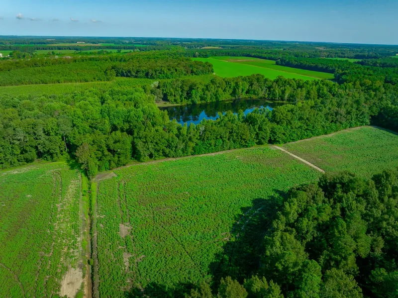 The land boasts nearly 50 acres of mature longleaf and loblolly pines mixed with hardwood, ideal for wildlife like deer, as evidenced by the numerous active trails throughout the area. The surrounding landscape is dominated by lush agricultural fields of soybean, cotton, and peanuts, adding to the property's rural charm.