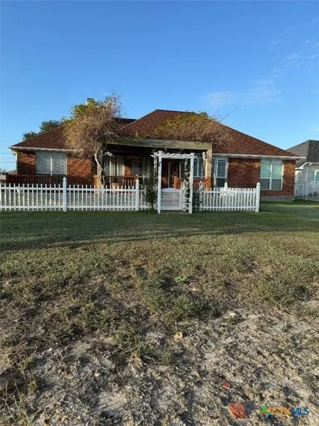 WATERFRONT! Beautiful 3 bedroom, 2 bathroom, brick home with a 2 car garage overlooking Lavaca Bay. Grand Oak tree in the front yard and sweet smelling Wisteria on a trellis in the back yard. This lovely, well-maintained open concept home has ceramic tile and laminate flooring, double pane windows, a covered wooden deck surrounded by a brick paved patio and a panoramic view. New seawall.