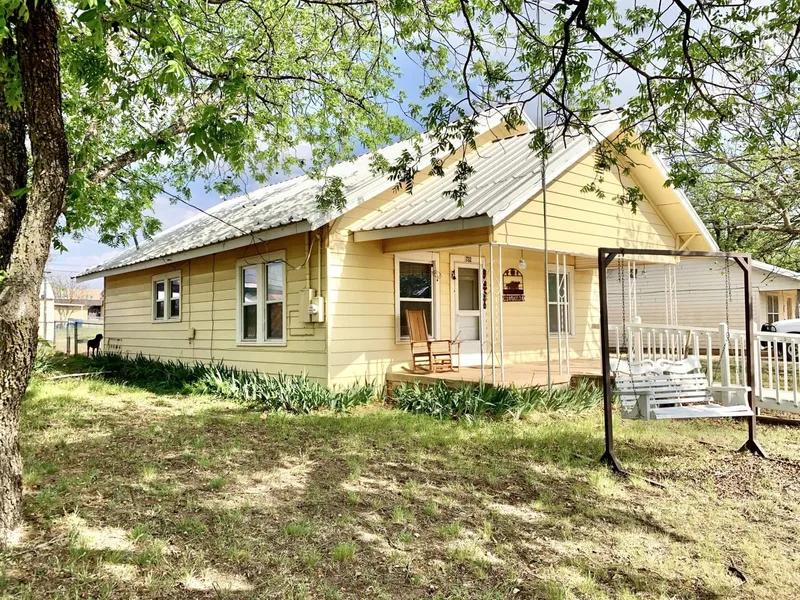 Adorable mid-century 2 bedroom, 1 bath home located one block from schools. Featuring an inviting front porch with 4 pecan trees in the yard. Nice wood floors, original wood cabinets with so much charachter! Large bedroooms and a large eat-in kitchen. Laundry room just inside back door with ample space. A metal roof, 2 carports, a storage building and an additional large storage building, currently used as a man-cave and small shop area. This nice corner, tree covered lot is spacious and beautiful! Call to take a look at this adorable home today!