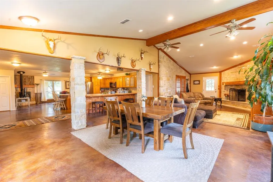 Enjoy quiet country living in this 3-2 rock home with a metal roof sitting on over 4 acres! The beautiful den has a cathedral ceiling, rock fireplace, built in entertainment & storage, lots of light! It adjoins the dining area and kitchen which has a huge tiled peninsula with lots of room for friends and family to gather. The spacious primary quarters has an attached office, walk-in closet and room for a sitting area. Ensuite bath has jetted tub with cedar surround, dual vanity and separate shower. 2nd living has a wood burning stove for cozy winter evenings. The laundry room has a door to the outside so also can serve as a mudroom. Two more large bedrooms and a bathroom with built ins complete the floorplan of this 2,496 sq. ft home. Outside there are 2 porches-one with a fireplace, 3 bay carport, 20x20 storage shed, water well, brick BBQ grill, garden plot, pasture, round pen, chicken ...