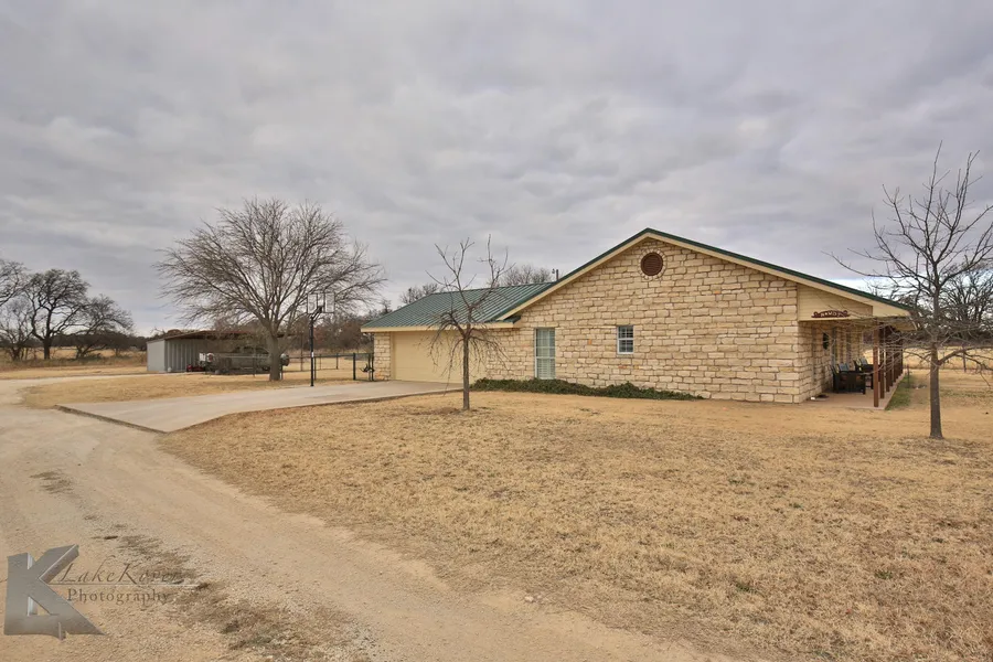 Beautifully updated 3 bedroom 2 bath split floor plan home on over 9 acres just 15 minutes Southeast of Abilene. Home features wood floors in living areas, dark stained wood trim throughout, plantation shutters, all new paint inside and out in 2015. Open concept living-dining-kitchen with vaulted ceilings and exposed beams, wood burning fireplace, dark stained kitchen cabinets, and full sized laundry room leading out to the garage. 2 car carport as well as a 2 car garage, fenced dog run area, and a 12'x24' storage shed. Property was completely fenced in 2016 with high tensile goat net wire and has automatic gate entry. Also has a cattle shed and 2 working water wells to irrigate the established coastal.
