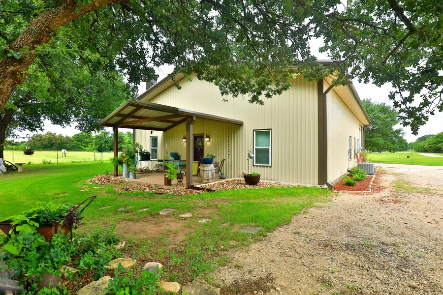 Cozy Country Living secluded by huge oak trees, 2 bedroom, 2 bathroom Barndominium beautifully nestled on 6 acres north of town. Open floor plan with 10 ft ceilings, walk-in closets, brick fireplace, farmhouse barn doors and subway tile in the kitchen and the bathrooms. Gorgeous stamped, stained concrete floors and concrete kitchen counter tops. 830 SqFt 2 car garage-shop is attached. Covered porch in front and side, great for relaxing, watching wildlife and the sunset. Active water well, new water-well pump, pressure tank put in 3, 2021. West of the house surrounded by large oaks trees is a 30x40 concrete shop-tack and feed room, a 30x60 covered livestock barn, 20x30 RV carport, electric and well water.