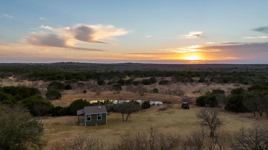 Cabin: The 250 square foot cabin is solar powered and has two beds, a wood burning stove, a window unit ac, interior lights, and can be used as an overnight hunting blind. The cabin has panoramic views and sits above a stock tank. A 150 square foot utility shed is located outside the cabin.