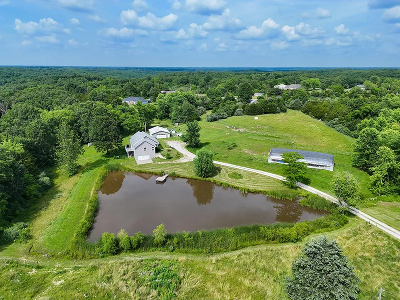 Welcome to peaceful country living on 7.09 acres of beautiful open land wrapped in trees! This charming ranch overlooks a stocked pond with a dock, firepit, and seating area for year-round enjoyment. Inside, the cozy living room features custom built-ins and a gas fireplace, while the farmhouse-style kitchen boasts stainless appliances, decorative glass cabinets, and sleek dark countertops. French doors lead to a back deck and partially fenced yard. The property includes chicken coops, bee hives, pastures, and a massive greenhouse — perfect for homesteading or hobby farming. A full walkout unfinished basement and four garage bays offer endless storage, workshop, or expansion opportunities. Peace, privacy, and potential all in one place! Bring your fishing pole and your morning coffeeboth can be enjoyed without leaving home. This 2017 ranch rests on 7.09 acres, tucked beside a stocked pon...