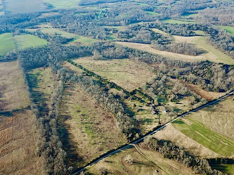Tract 1: 50 flat to gently rolling acres of pasture, woods, outbuildings, and 2bd,1ba farmhouse with updated roof in 2019 with el...