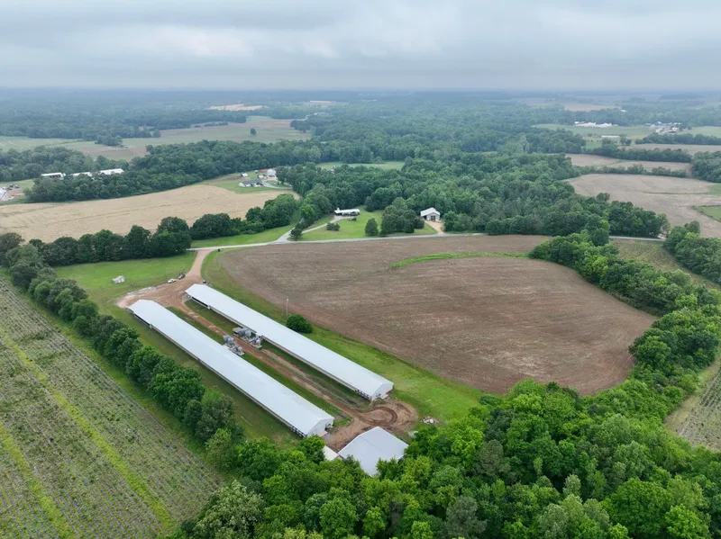 This property offers a unique blend of residential comfort, agricultural production, and recreational potential, making it a strong, income-generating investment. The centerpiece is a two-barn breeder farm, built in 2005 and currently under contract with Pilgrims, providing a reliable income stream. The manicured facility includes a gravel drive and parking area, storage barn, equipment shed, and is well maintained for operational efficiency. The tract also features 11+/- tillable acres currently planted in soybeans for the 2025 growing season, offering additional agricultural income. The 1,680 S.F., 3BR, 2BA home includes a spacious living, kitchen, and dining area, along with a master suite, covered front porch, and a back deck overlooking a beautifully landscaped and maintained yard with garden areas. A large shop building with a concrete floor, finished office space, and workshop with electric, heat, and air provides the ideal space for on-site management or storage. The landscape transitions into timbered ridges and draws, featuring a healthy stand of softwoods and mast-producing hardwoods, offering prime deer and turkey hunting opportunities. The property boasts 1,500 feet of frontage along Terrapin Creek, a natural corridor for wildlife, and 1,700 feet of road frontage with multiple entry points for easy access. Whether you're looking for an operational farm, a beautiful country home, or a place to enjoy outdoor recreation, this property offers a well-rounded portfolio of value and potential. Give us a call today and schedule your private tour!