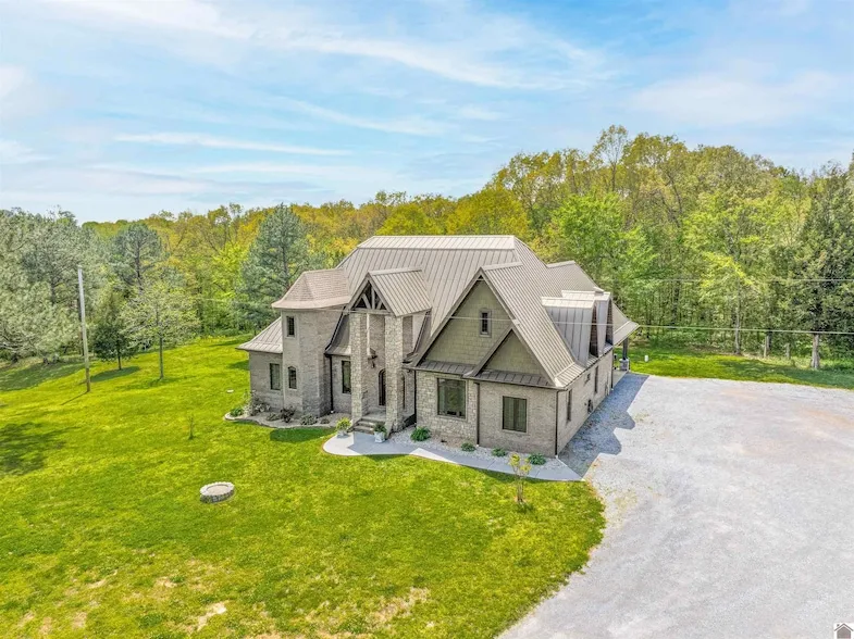 This custom built 4 bdrm/3 full bath brick home is a must see! Situated on five beautiful acres, affording privacy and space. The architectural design inside and out gives this property so much character. Interior features poplar tongue and groove wood on ceilings, live edge floating hickory staircase, custom wood trims throughout, gas log fireplace in living rm, granite counters in kitchen, with concrete top on island, expansive built-in buffet in formal dining, den, and separate office space. Hardwood and tile throughout. Custom designed and built front door. Detached shop has half bath, much storage, open unfinished rm upstairs plumbed for bath. Standing seam roof on home and shop. Conveniently located within five miles of city limits.