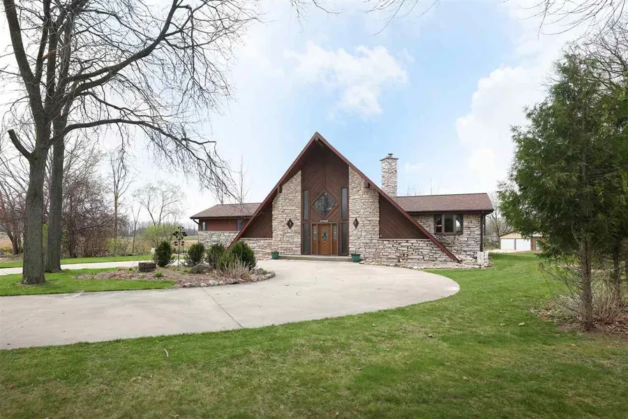 Your own gem, just outside the city. Contemporary home with lots of wood & stone finishes throughout. 4 Bedroom, 2.5 Bath home, two story, open concept foyer has soaring ceilings with the foyer overlooking the great room with floor to ceiling stone rounded fireplace. Hardwood floors in the living room lead you to the sunny landing with patio doors that overlook the back deck and 1 acre lot w/ a stocked landscaping pond, mature trees and additional, new 20X25 ft garage. Master on the main w/ attached BA, LARGE Kitchen and Dining area. Attached 2 car garage. This custom built home is a must see.
