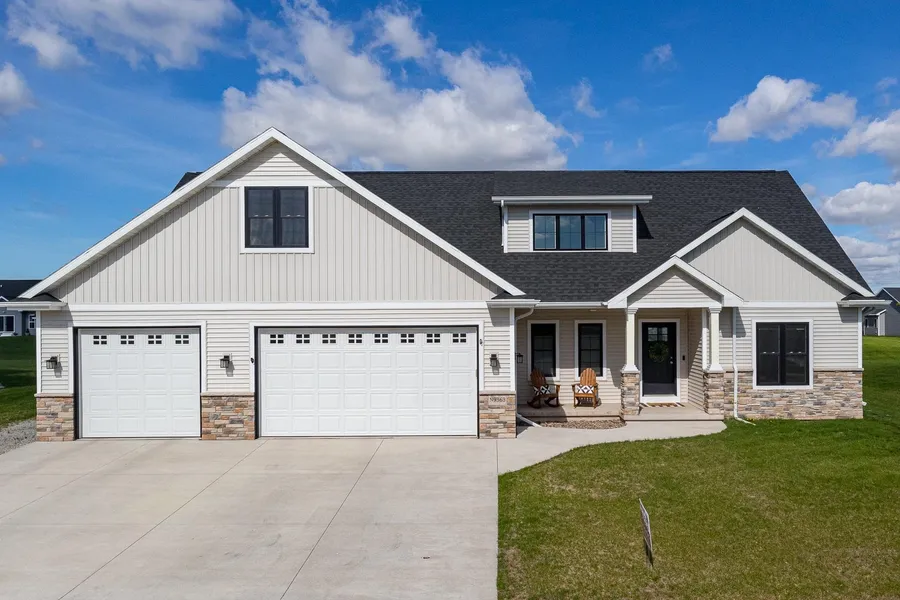 Score Big with this Grand 1.5 Story on Touchdown Drive! Features include: Open living room with floor to ceiling fireplace (gas). Kitchen with large granite center island, stainless steel appliances, walk-in pantry and dining area with glass door to large concrete patio and covered pergola. First floor primary suite with walk in closet, double sinks, walk in tile shower. First floor office, laundry, locker/bench/hook area. Upstairs find 3 additional bedrooms, private toilet and shower area with double sinks. Bonus room too. The lower level is stubbed for future bath and has 2 egress windows. Two zone heating. Insulated garage with floor drain. Improvements include: window treatments throughout, concrete patio, steps and pergoal and gravel parking pad.