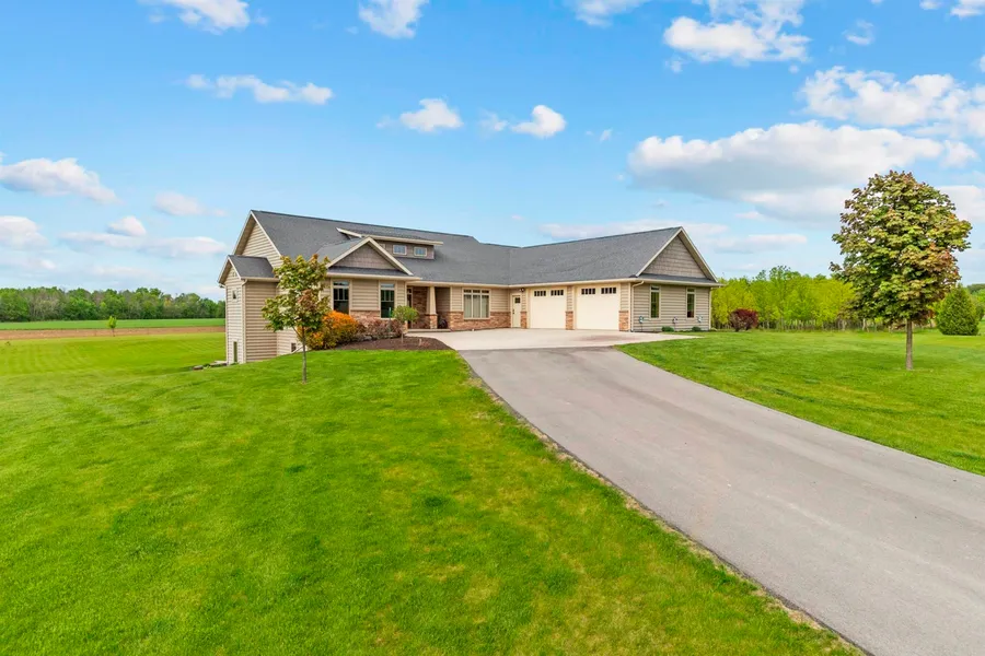 Quality built split bedroom walkout ranch on 5.40 acres (per assessor) with views in all directions. This home features open concept dining/kitchen/living room with wood burning fireplace plus a formal dining room, primary bedroom with two walk in closets and an on suite bath with tile shower, large mud/laundry room with lockers, bedrooms 2 & 3 with Jack N Jill bath plus a half bath for guests. Lower level has in floor radiant heat with a rec room and wet bar, office with glass French doors, bedrooms 4 & 5 and a 3rd full bath and attached 2+ car heated garage. Outside you will find a covered patio plus a large deck overlooking the well kept yard and last but not least is the 48x24 heated 2nd garage with large overhang. Per seller no showings until May 28th