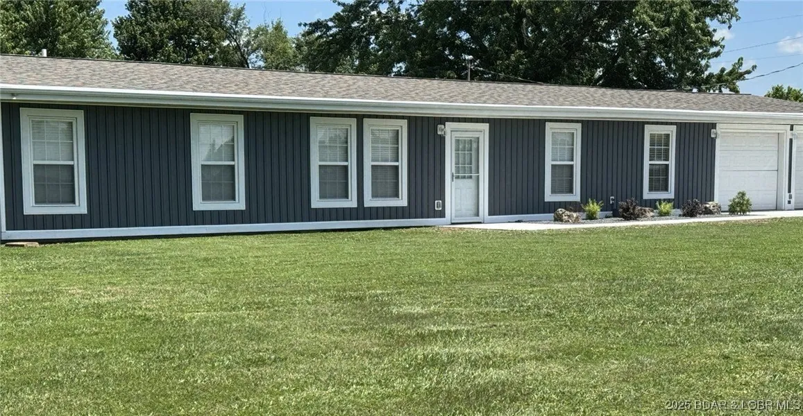 Best Location for country living! Close to everything only 3 miles to Camdenton and 2 miles from Highway 54 down State Hwy V. You will enjoy and find multiple advangage on this flat open/cleared of 1.8 acre property. This 1967 sq. ft. home features a ranch style with NO STEPS, full kitchen with island and large pantry closet. Kitchen/dining area are open and spacious with a walkout slider to the newer concrete patio. The home has two bedrooms on one end with a full bath, a large master suite on the other end with a large bath that features a jacuzzi tub, walk-in closet, separate toilet and shower. All closets have lighting. Newer concrete driveway. Attached double car garage 23.5x23 with lots of cabinets and separate finished 128 sq ft. workshop, work benches. Newer siding, roof, and concrete patio and sidewalks in 2025. Upgraded features throughout includes; flooring, drywall and 12 gage wiring suitable for higher-power appliances. Newer 12x20 storage shed on a large concrete slab.. Partially fenced yard, beautiful plants, trees and views, newer downspouts, buried under ground. Nov. 2025 new commercial grade poly septic installed. Make this your home for years to come.