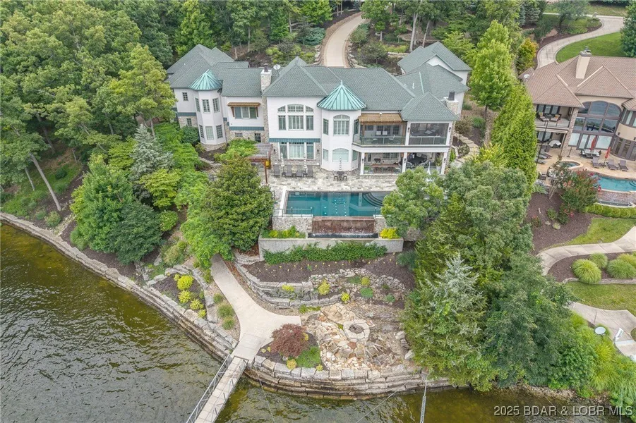 Welcome to an iconic lakefront estate in The Villages at Shawnee Bend-the lake's premier non-rental luxury community. Situated on 2.5 private wooded acres with 180 degrees lake views, this nearly 8,000 sq ft custom Wayne Thomas-built home offers timeless design, modern indulgence, and the benefits of a full remodel completed in 2020. Fully furnished and move-in ready, it features 5 ensuite bedrooms including a serene primary wing with spa-style bath, a chef's kitchen with 3 islands, wine cellar, theater, and 5 fireplaces. Entertain in style with a full bar, infinity-edge pool, and a beautifully landscaped, wisteria-covered cart path that leads to your private 4-slip dock nestled in a no-wake cove with stunning main channel views. The property also includes a guest suite, heated flex space, epoxy-finished garages, and a full pool bath with steam shower. Pre-inspection has been completed a...
