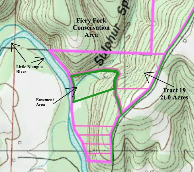 This 21 acre tract of land is one of the most special properties we have ever offered. Tract 19 at Fiery Fork Ridge has over 500 feet of DIRECT frontage on the Little Niangua River as well as over 1,500 feet of DIRECT frontage on the Fiery Fork Conservation Area. The east side of Tract 19 borders the private gravel easement road. There is a small amount of meadow on the east side (just off of the private road). The property slopes down as you head west then it slopes back up again on the west side. The west side of the property has an AMAZING view of the river and then river valley.