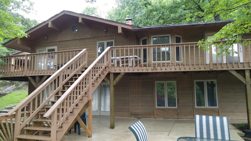 BIG PRICE REDUCTION! MOTIVATED SELLERS. Beautifully maintained, park-like setting on this lakefront home with 1.07 acres. Cove protection & main channel view at the 60 mile marker at Lake of the Ozarks. Lots of extras: huge rock waterfall, terraced yard, lots of lakefront, boathouse w/2 small garage doors, fabulous concrete patio over boathouse, plenty of parking on concrete drive, oversized 2-car detached garage w/large loft above, Pella windows & storm doors w/enclosed mini-blinds, minimal stairs between levels, very large MBR added, bamboo hardwood floors upstairs, & hot tub. Spacious lower level family room with space for extra sleeping, an exercise room or game room. Bonus room for a workshop, extra pantry, storage, whatever. 2-well dock with swim platform & 2 boat hoists. Put this on your list to see!!!