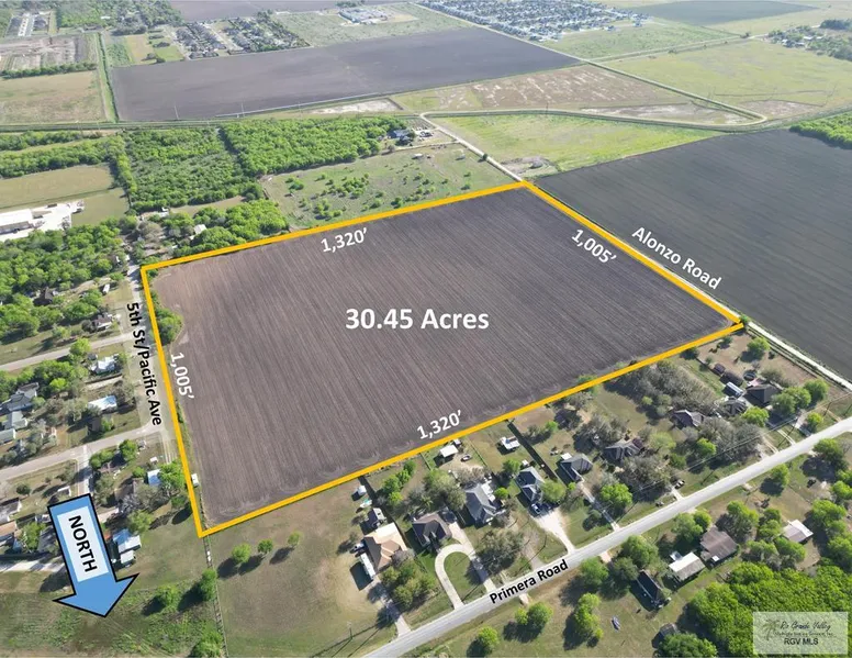 This is a great piece of development land that connects to the City of Primera. This property has all city utilities within a few hundred feet of the land. The North 10.45 acres of this land is located in the City of Primera and the southern 20 acres is located in Cameron County. This is irrigated land that is currently being rented for farming. The property has 1005' of frontage on its west side on Alonzo Rd (gravel, one lane road), and +/-700' of frontage on the east side on 5th St/Pacific Avenue. The land is located in Flood Zone "X" which is the best flood designation. This tract could be divided into three sections for 10 Ac. homesites or full subdivided into residential or possible a multi-family neighborhood. If you are interested in purchasing a larger tract of land, the property across Alonzo Rd is +/- 39 Acres and available for $22,000/ac.
