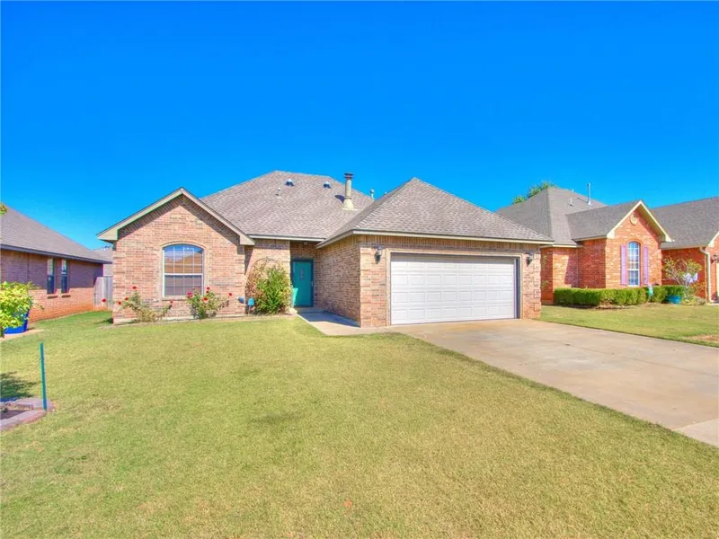 Super, move-in ready home in coveted Mustang Schools! Home has had many updates throughout including solar tubes for natural light in the living room, paint, and LVP flooring. Nice, open kitchen/dining/living, living offers a TV nook and fireplace. Kitchen features a breakfast bar, stainless appliances, abundant cabinets and upper cabinet lighting. Through the kitchen is a dedicated utility room with large pantry. Master bedroom has access to the covered patio and wood deck; also features a jetted tub, 2 sinks, and walk-in closet. Layout features two bedrooms and one bath on one side of the home and master bed is off the living room. Large storm shelter in the garage floor