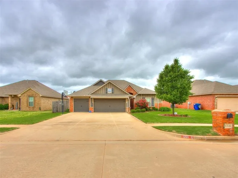 Beautifully maintained, 4 bedroom, 2 bathroom home with upgrades you do not want to miss! Built in 2016, this single story residence features an open-concept layout with vaulted ceilings, a cozy gas fireplace, and a spacious living area. The kitchen is a chef’s dream with granite countertops, stainless steel appliances, a decorative tile backsplash, island, and walk-in pantry. The master suite offers a relaxing retreat with a soaking tub, walk-in shower, double vanities, and an expansive closet featuring seasonal hanging. This home is a true 4 bedroom home. Additional bedrooms are generously sized and perfectly laid out. Upgrades include a new whole home generator with a transferable warranty, in-ground garage storm shelter, hardwired security system, and front and backyard sprinklers add convenience and peace of mind. The oversized garage is big enough to fit a truck and features new WiFi-enabled garage door openers for modern accessibility. Enjoy outdoor living on the covered patio overlooking a landscaped yard. Located in a desirable neighborhood with access to a community pool and greenbelt, this home is in the Mustang Public School District and close to shopping and dining. Move-in ready and full of charm, this home blends comfort and convenience in one perfect package.