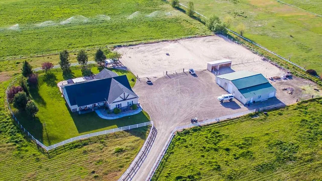 Gorgeous, single level home on 5+ irrigated acres. Spacious open floor plan with vaulted ceilings. Enjoy the sunsets on the on the beautiful covered patio with outdoor kitchen/bbq. Oversized 3 car garage with RV door. Huge barn/shop (45x60) that is heated and wired for manufacturing it has 2 large doors, and also has separate living quarters attached. Riding arena with sand foundation, separate pastures, 5 stalls, auto water trough, 2 wells, 2 pellet stoves (one in house, one in shop).