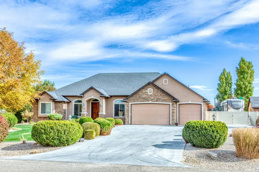 Welcome to a private paradise. Set on a quiet dead end street, this pristine property, on a meticulously landscaped acre offers luxurious living outside and in. This 4 bedroom, 3 bath single level home features a split bedroom floor plan, a large great room, a primary suite with a walk in closet, along with a glamorous primary bath with soaker tub, dual head shower, and a large dual vanity. The east facing back yard features a covered patio with outdoor kitchen, a dining gazebo, a hot tub gazebo, a custom fire pit, considerable garden space, mature landscaping, numerous fruit trees, and a micro vineyard. The three car garage offers outlets for an electric car & an RV. You'll also appreciate the RV parking, the 12' vinyl gate, and the horseshoe driveway for easier access.
