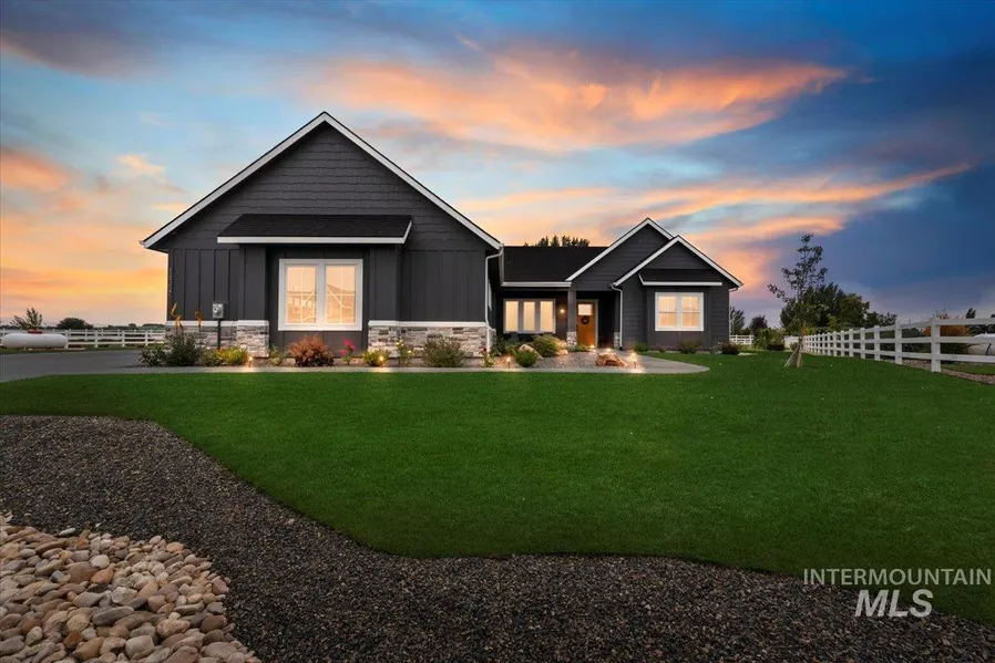 Filled with thoughtful upgrades and design features, this immaculate single-level home provides a better-than-new opportunity for the buyer looking for country living with city amenities. The well-designed floorplan features an open living concept with 4 large bedrooms and flexible office/5th bedroom. The kitchen is sure to impress with a massive quartz island, Bosch appliances, and ample cabinet space. Step into luxury with 10-foot ceilings, a spa-like primary suite, and premium LVP flooring. Soak in views of the Owyhee Mountains from this one-acre parcel featuring a well-manicured lawn, fruit trees, raised garden beds, covered back patio, shop, and an individual well and septic. The oversized 3 car garage features a locked room and built-in storage shelves. Walk to nearby Midway Park to enjoy all its fantastic amenities, or head to Lake Lowell for outdoor recreation!